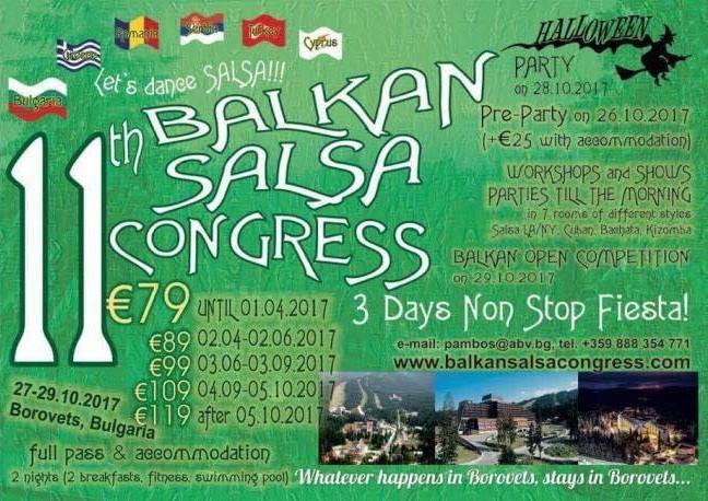 Над 100 участници от България, Гърция, Кипър, Румъния, Сърбия, Турция, Куба, Великобритания, Франция, Италия и др. ще пристигнат специално за единадесетото издание на Балканския Салса Конгрес! Очакват ви над 60 специални урока, 3 партита с 10 DJ-я от България, Гърция, Румъния и Турция, 2 вечери с парти с музика на живо, вечери изпълнени с вълнуващи шоута, а в неделя ви очаква и оспорвано състезание! Всяка вечер след полунощ ще се наслаждавате на любимата си музика в 6 различни зали, а на 28.10 се подгответе за специално Хелоуин парти!